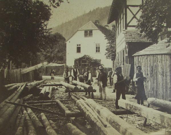 Aufnahme vor 1890: Bebeilen der Hölzer auf der Straße, mit Melone Johann Friedrich Macheleidt, ganz rechts das Gründungshaus des Schwarzburgbundes